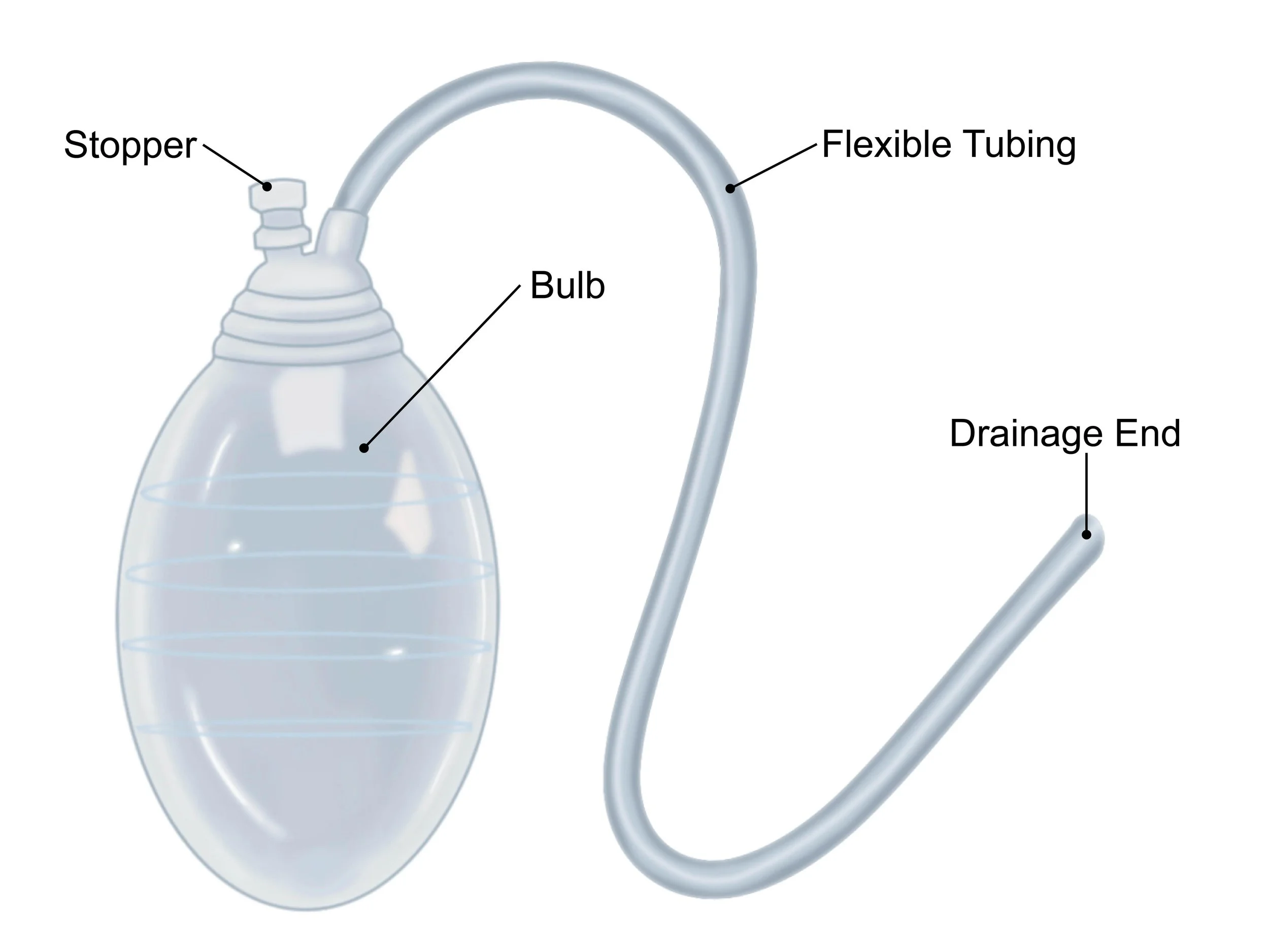 Outside the body, the bulb (often called the “grenade”) provides suction when compressed; a properly functioning drain will have a flattened or concave bulb, indicating that suction is active. As the bulb begins to fill, the fluid you see is typically pink or reddish in the early stages of healing and gradually becomes clearer over the next several days.